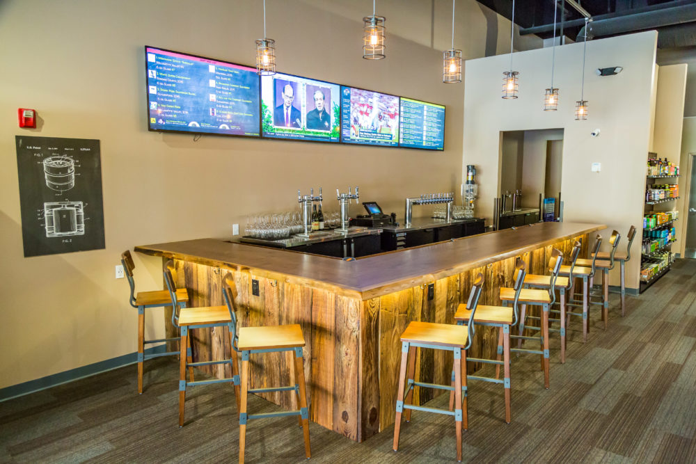Our tasting bar is comprised of 16 draft beers, always including a mead and cider, and 8 wines on tap. Come check us out!
